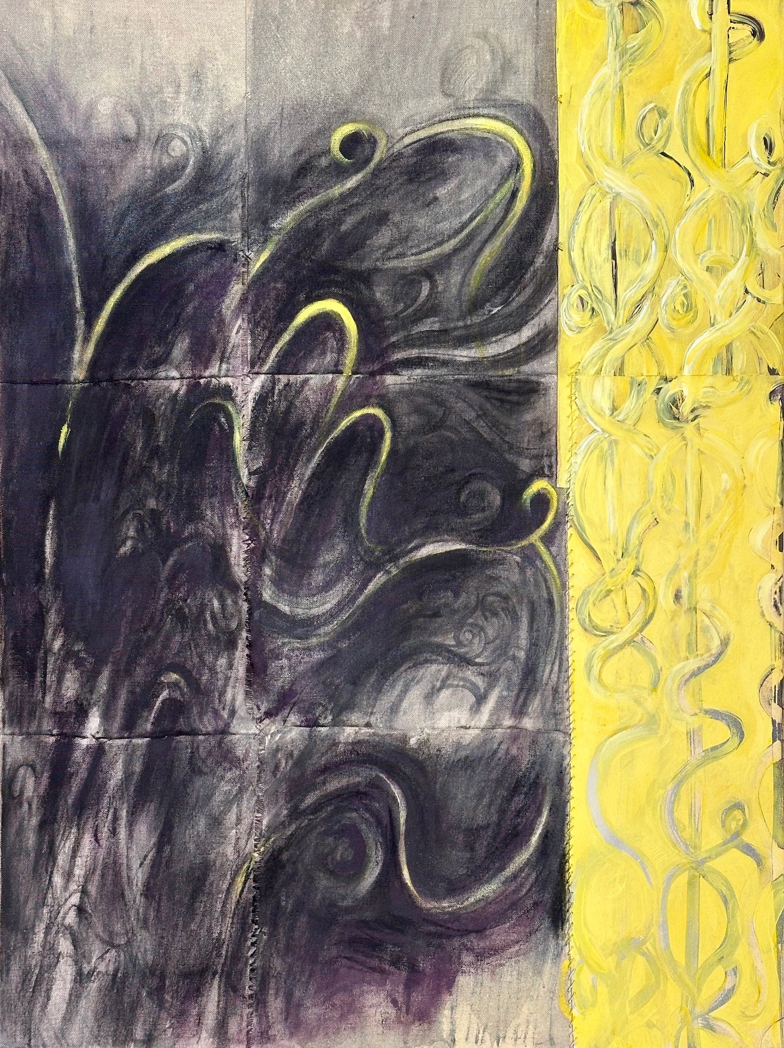 Acrylics, oil, coal and spray on handsewn canvas